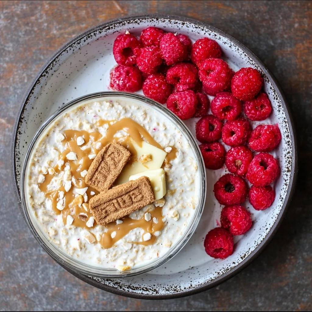 A creamy and delicious breakfast option that offers a protein-packed punch, featuring rolled oats with fresh raspberries, white chocolate, or Biscoff.