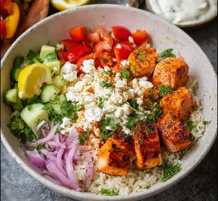 6. Assemble the Bowls: Divide rice among bowls. Top with salad and broiled salmon. Add dollops of herby yogurt sauce, sprinkle with crumbled feta, and garnish with extra herbs and a drizzle of lemon juice and olive oil.