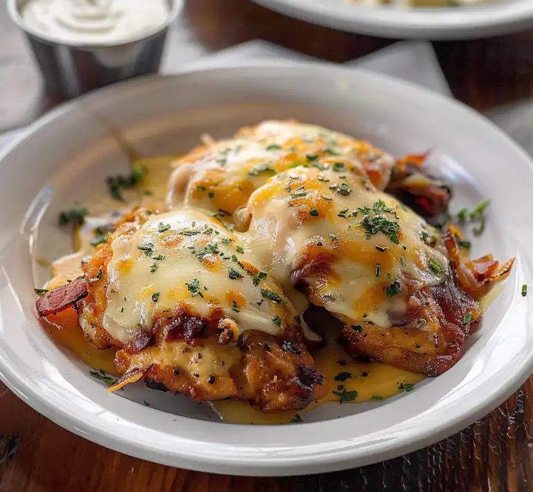 Juicy chicken breasts topped with bacon, cheese, and honey mustard sauce that recreates the beloved Outback Steakhouse dish at home.