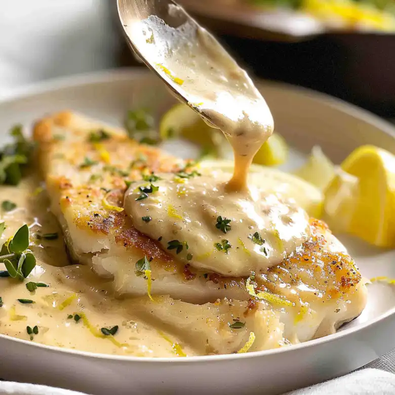 Tender baked white fish topped with a rich, creamy lemon sauce. This elegant yet simple dish is perfect for weeknight dinners or special occasions.