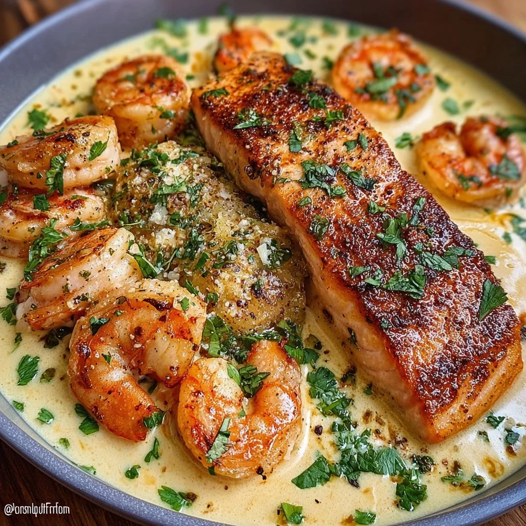A delightful seafood medley featuring flaky salmon and succulent shrimp in a rich, creamy garlic sauce.