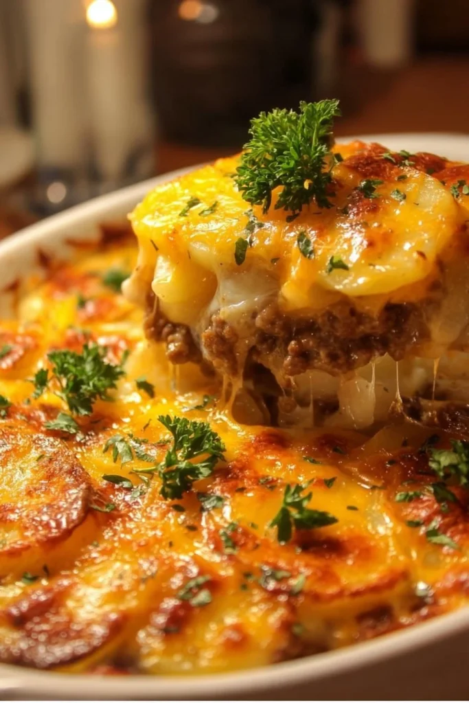 A comforting and hearty casserole featuring layers of tender potatoes, beef, and melty cheese, perfect for a family dinner.
