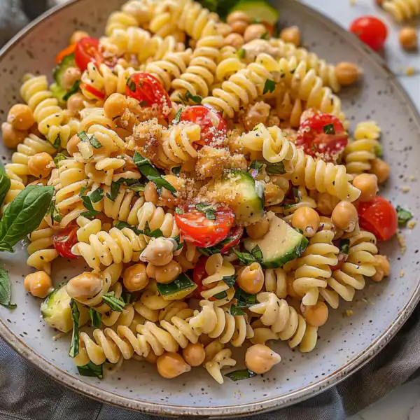 A hearty pasta salad loaded with chickpeas, fresh vegetables, and herbs, all tossed in a creamy tahini dressing. Perfect for meal prep, potlucks, and summer gatherings.