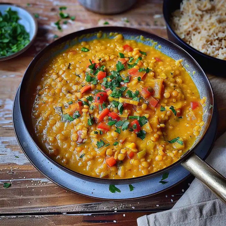A creamy, aromatic red lentil dahl made with coconut milk and warming spices. This comforting dish is naturally vegan and packed with plant-based protein.