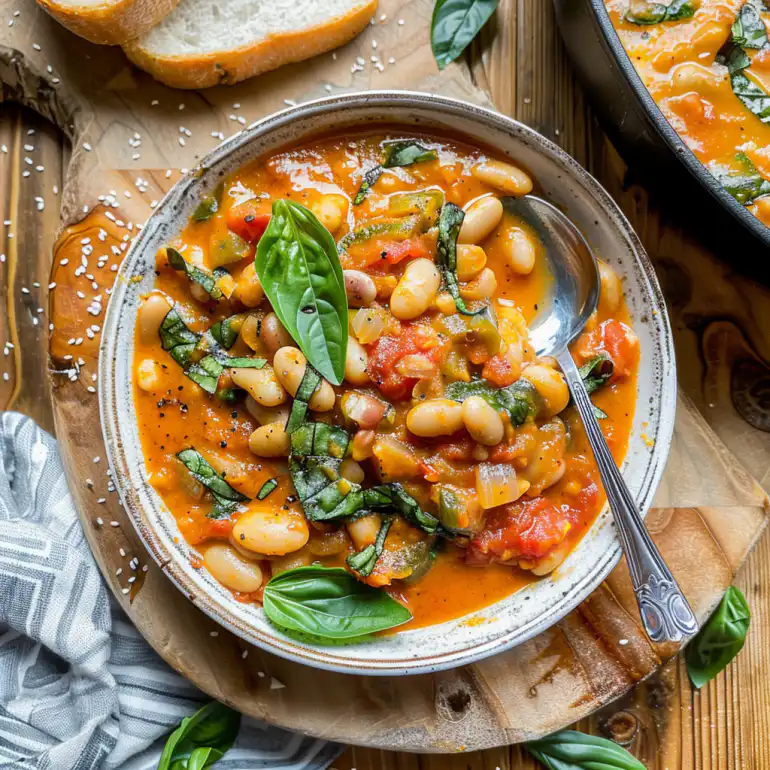 A hearty, comforting stew featuring white beans in a rich tomato base with coconut milk creaminess. Plant-based comfort food at its finest.