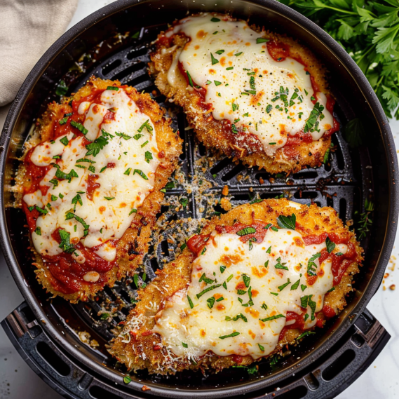 Enjoy all the classic flavors of chicken parmesan with this healthier, crispy air fryer version. Made with lean chicken breast, panko breadcrumbs, and marinara sauce, it’s a guilt-free Italian favorite.