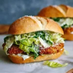 7. Assemble the Sandwich: Slice open your baguettes. Spread the prepared dressing inside, add the crispy chicken, and top with the Caesar salad made from romaine dressed with the reserved dressing. Sprinkle with more Parmesan, close the sandwich, and serve immediately.