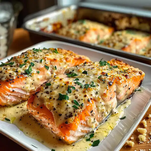 Tender salmon fillets topped with creamy Boursin cheese and golden breadcrumbs, baked to perfection in just 15 minutes.