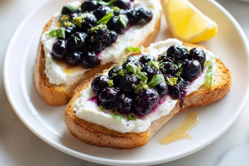 A delightful combination of rustic sourdough bread topped with creamy ricotta and sweet blueberry compote, perfect for breakfast or dessert.