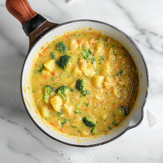 - 3. Stir in broccoli florets and diced potatoes. Pour in broth. Bring to a boil, then reduce heat, cover, and simmer for 15-20 minutes, or until potatoes and broccoli are tender.