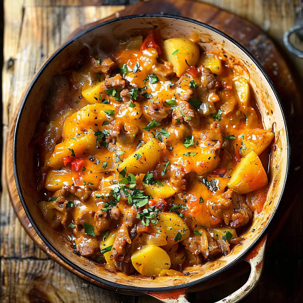 A hearty one-pot meal featuring seasoned ground beef, tender potatoes, and melted cheese all cooked together for easy cleanup and maximum flavor.