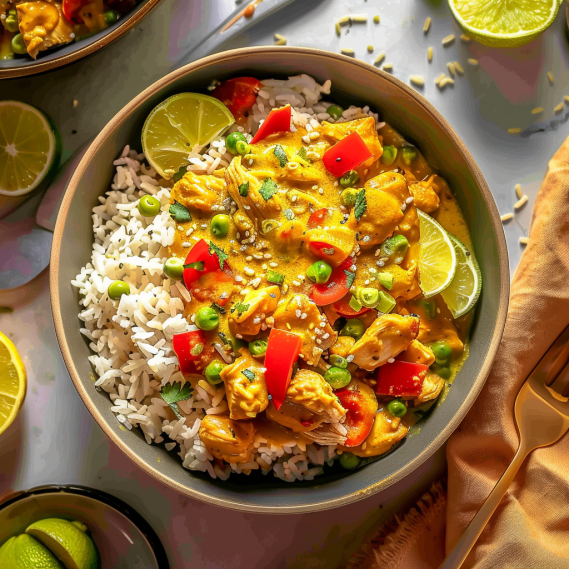 A quick and flavorful weeknight meal featuring tender chicken simmered in a creamy coconut sauce, served over fluffy jasmine rice. Simple ingredients, delicious results.