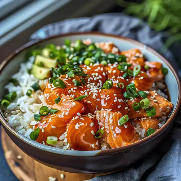 This method ensures crispy-skinned salmon with tender, flaky flesh served over perfectly seasoned rice with fresh, vibrant toppings.