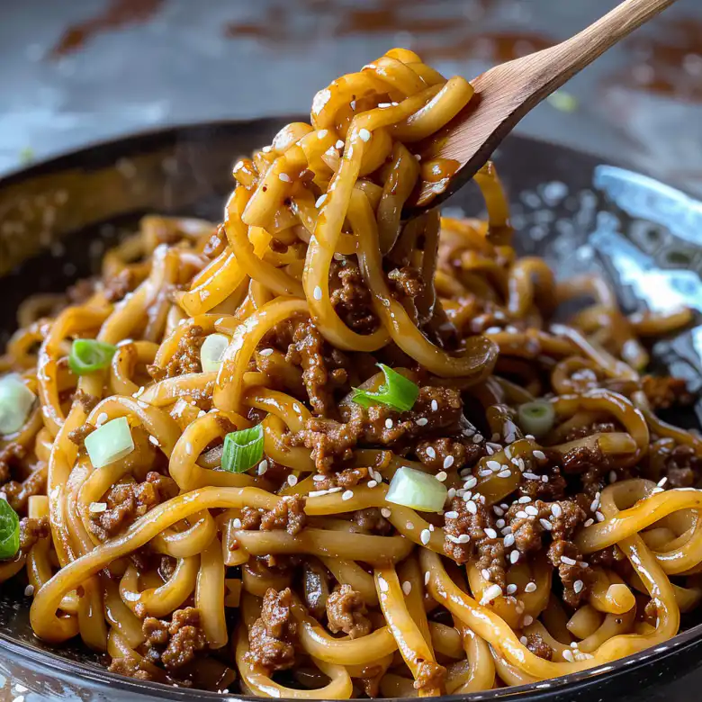Savory-sweet ground beef and tender noodles in a rich Mongolian-style sauce