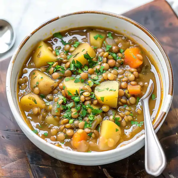 A hearty, protein-rich soup combining tender red lentils with creamy potatoes in a flavorful vegetable broth. Simple ingredients create a satisfying, nutritious meal.
