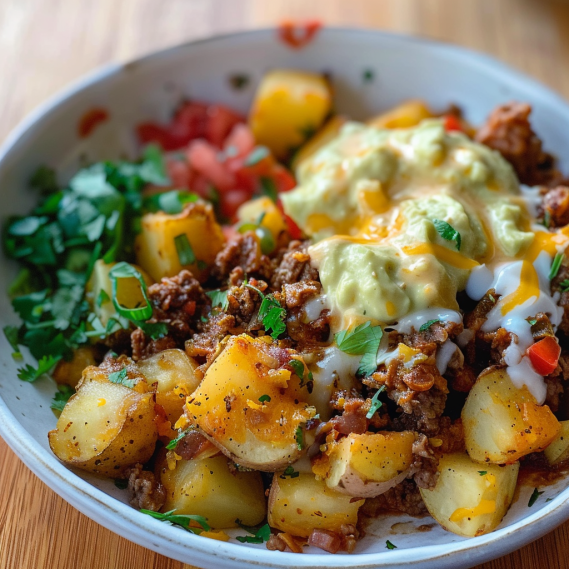 A hearty and adaptable Loaded Potato Taco Bowl recipe featuring roasted potatoes, seasoned ground beef, and your favorite taco toppings. Easy to make and perfect for weeknights or gatherings.