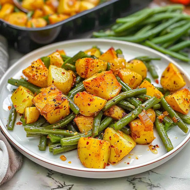 A hearty one-pan dish featuring tender potatoes and crisp green beans simmered with aromatics, tomatoes, and herbs. This versatile recipe works as a main course or side dish.