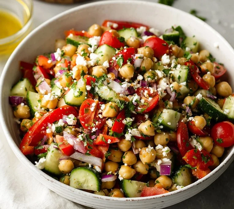 A bright and refreshing salad featuring protein-rich chickpeas and vibrant vegetables, perfect for a healthy meal.