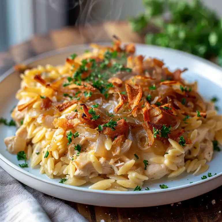 This comforting one-dish meal brings together the rich, caramelized flavors of French onion soup with tender chicken and creamy orzo pasta. I’ve been making this casserole for my family for years, and it never fails to satisfy. The deep, savory onion flavor paired with melted cheese creates a hearty dinner that feels both familiar and special.