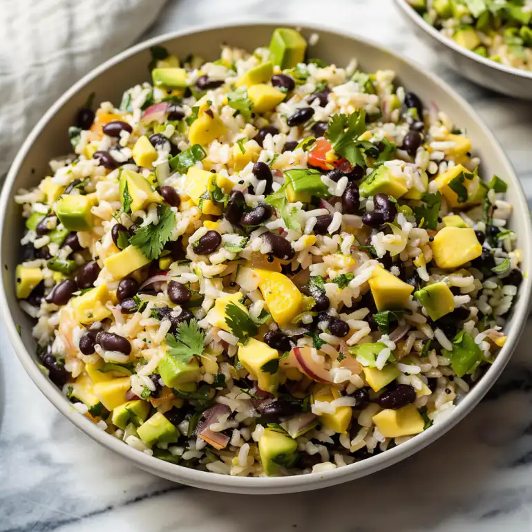 Fresh and satisfying salad combining rice, black beans, avocado, and vegetables in a zesty lime dressing. Perfect for meal prep or entertaining.