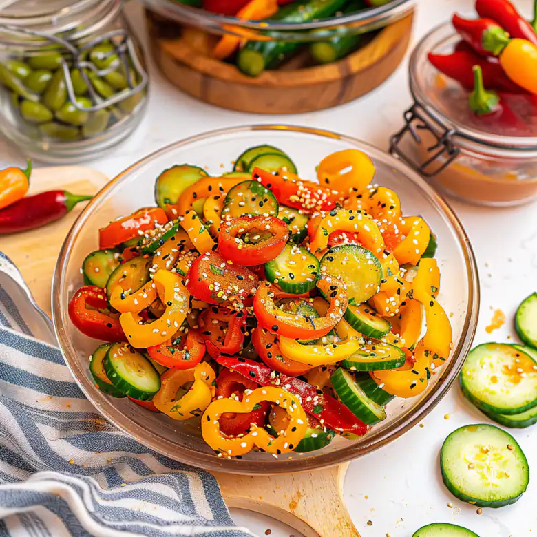 A refreshing salad combining crisp cucumbers and colorful bell peppers with a tangy vinaigrette dressing