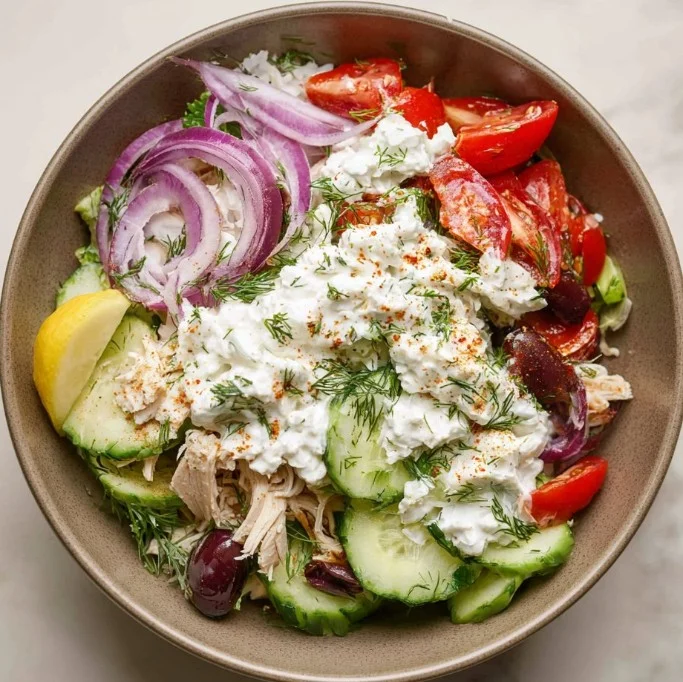 A quick and delicious Greek-inspired bowl featuring rotisserie chicken, fresh veggies, and a creamy tzatziki.
