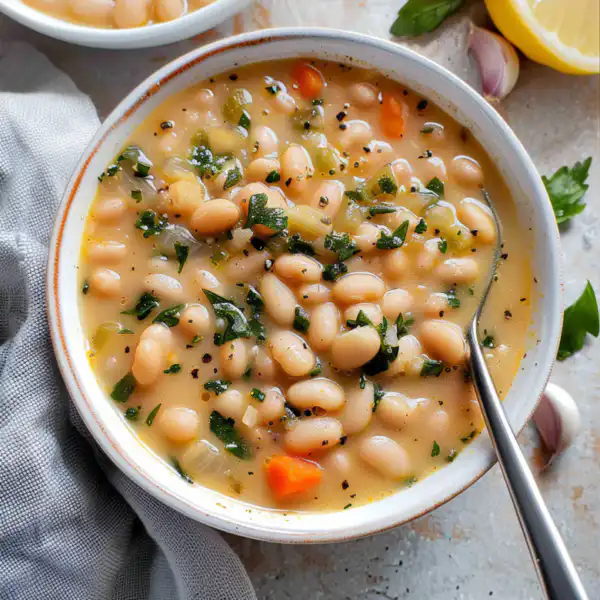 A hearty, authentic Greek white bean soup featuring tender cannellini beans, aromatic garlic, and bright lemon juice. This traditional recipe builds layers of Mediterranean flavor for a satisfying, nutritious meal.