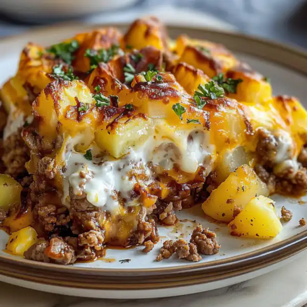 A hearty, family-friendly casserole layering tender potatoes with seasoned ground beef and melted cheese. This comforting one-dish meal bakes hands-free and feeds a crowd.