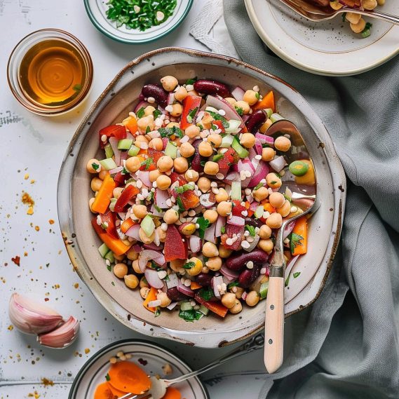 A flavorful and healthy bean salad featuring chickpeas, cannellini beans, and kidney beans with a zesty Dijon vinaigrette. Perfect for meal prep, picnics, or a light lunch.