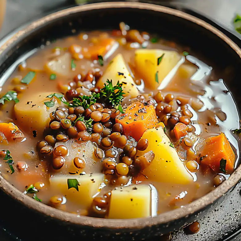 A nourishing one-pot soup combining tender lentils, creamy potatoes, and fresh vegetables for the ultimate comfort meal
