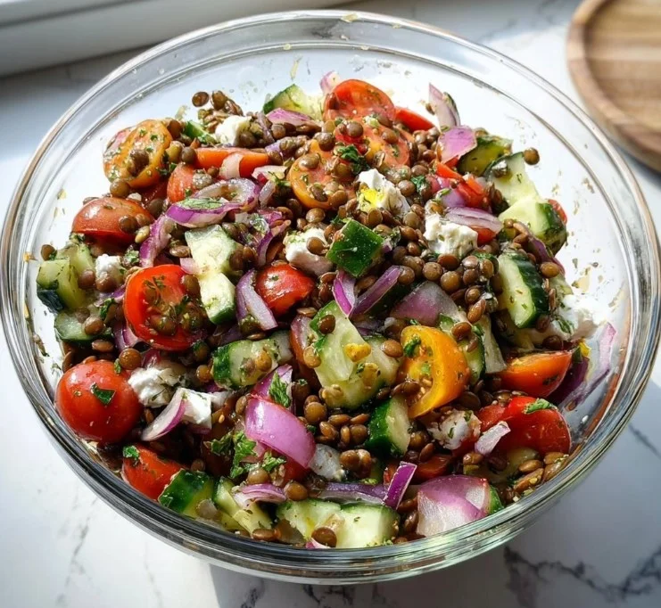 A nutritious and filling Mediterranean lentil salad that combines vibrant vegetables and a zesty dressing, perfect for meal prep and quick weeknight dinners.