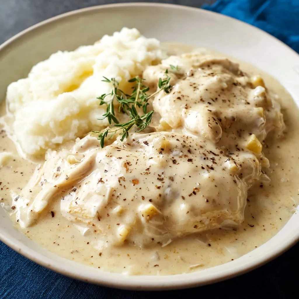 A comforting creamy chicken and gravy dish made effortlessly in the slow cooker, perfect for weeknight dinners.