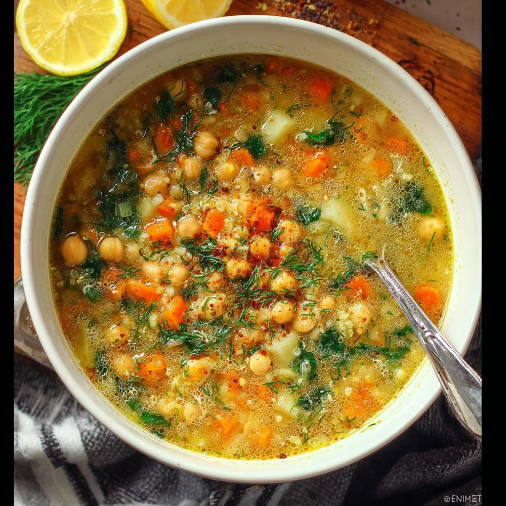 A comforting and nutritious soup made with chickpeas, vegetables, and aromatic herbs, perfect for chilly evenings.
