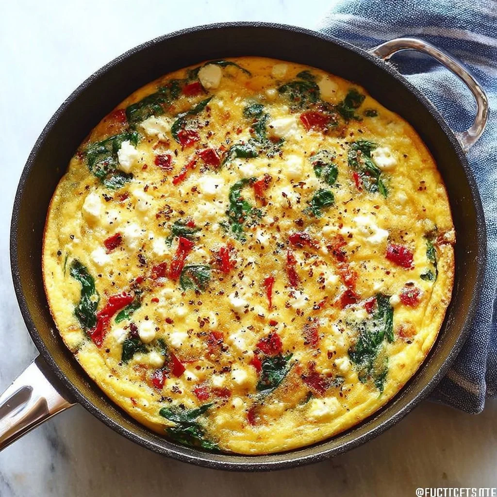 A fluffy frittata bursting with sautéed garlic, fresh spinach, and roasted red peppers, topped with creamy feta.
