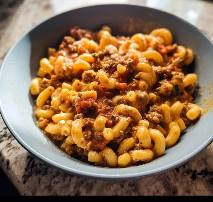 A quick and easy one-pan skillet meal featuring ground beef and elbow macaroni cooked in a creamy, savory sauce.