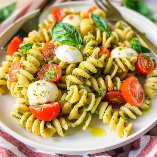 A refreshing and flavorful pasta salad featuring pesto, fresh mozzarella, and ripe tomatoes, all tossed in a creamy, zesty dressing. Ideal for lunches, picnics, or as a side dish.