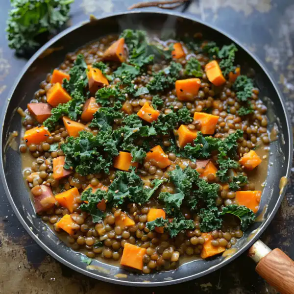 - Rich in fiber from lentils, sweet potatoes, and kale (approximately 15g per serving)