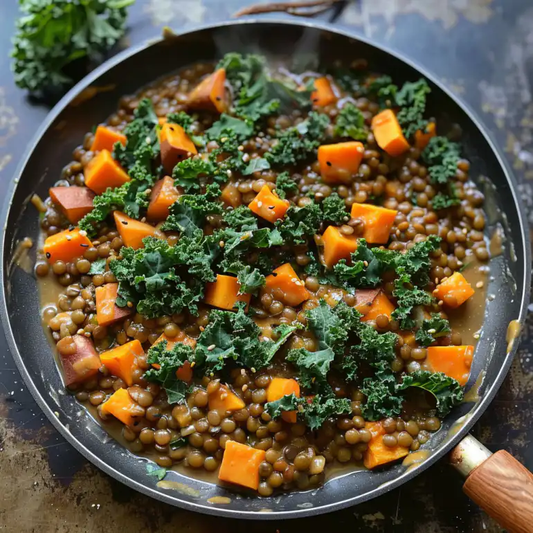 This hearty one-pan dinner brings together earthy lentils, naturally sweet Japanese potatoes, and nutrient-dense kale in a creamy, satisfying meal. I’ve been making variations of this recipe for years, and it never fails to deliver comfort and nutrition in equal measure.