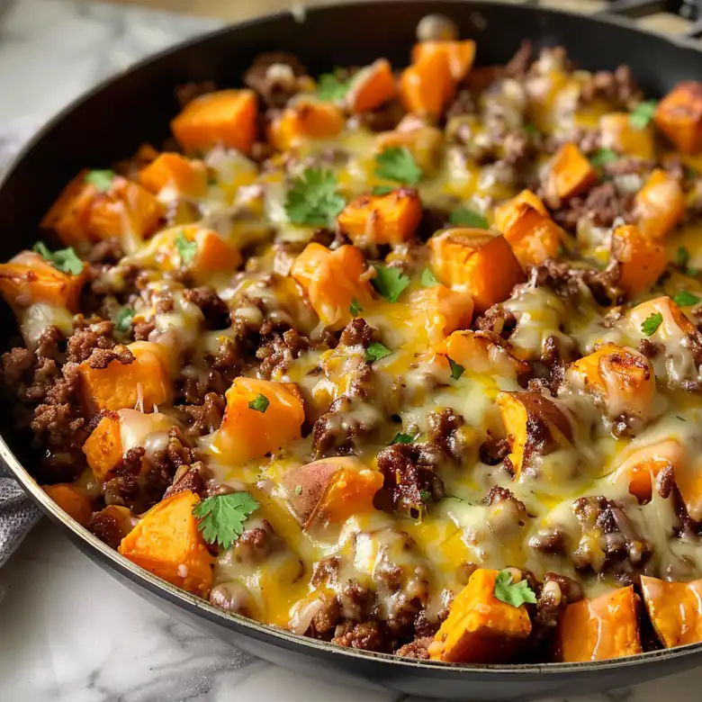 A hearty, flavorful skillet dinner combining seasoned ground beef, tender sweet potatoes, and classic Tex-Mex ingredients all cooked in one pan for easy cleanup.