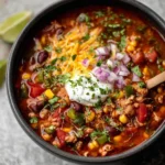 A hearty bowl of turkey taco soup packed with protein and vibrant flavors, ready in under 30 minutes.