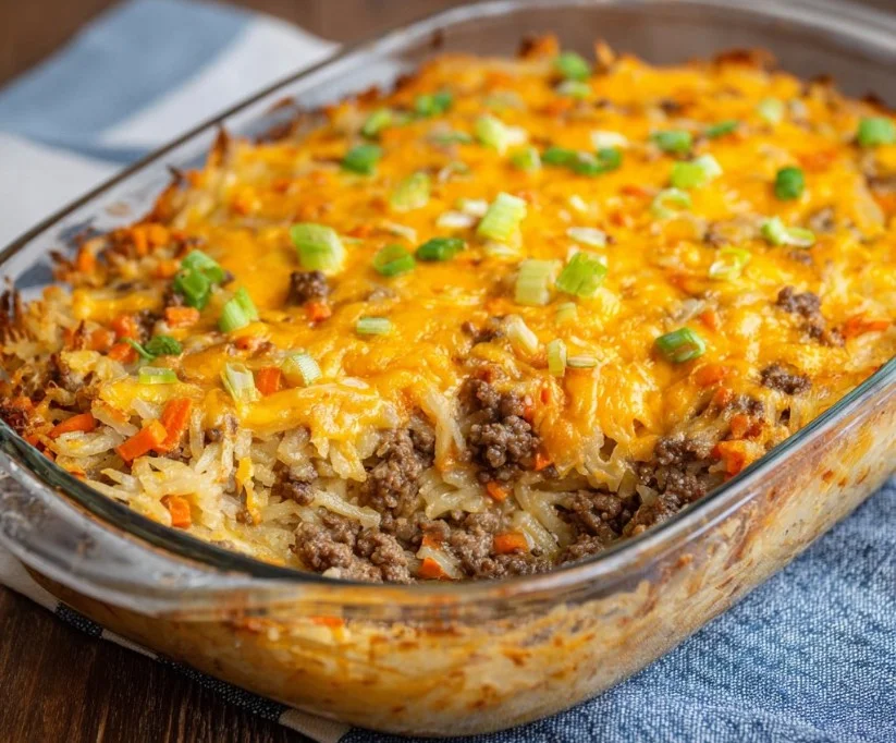 A comforting casserole filled with layers of savory beef, creamy cheese, and crispy hashbrowns, perfect for weeknight dinners and potlucks.