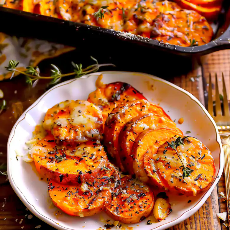 Tender roasted sweet potatoes with fragrant garlic and golden Parmesan cheese. A simple yet elegant side dish that pairs beautifully with any main course.