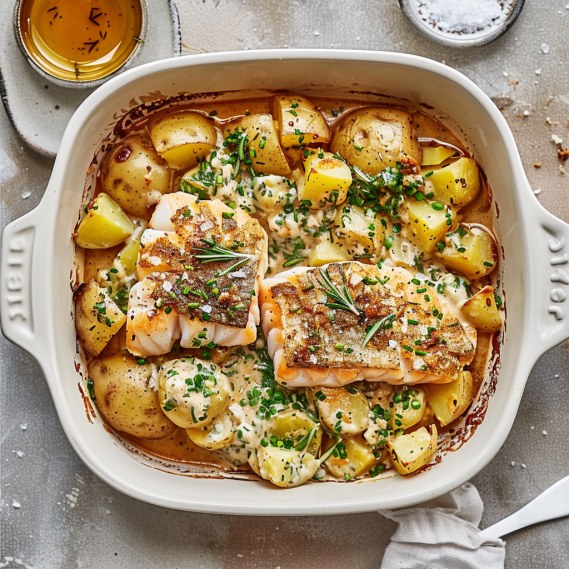 A comforting and easy recipe for Rosemary Cream Sauce Cod & Potatoes, featuring flaky cod and tender roasted potatoes in a rich, herbaceous sauce. Perfect for weeknights or special occasions.