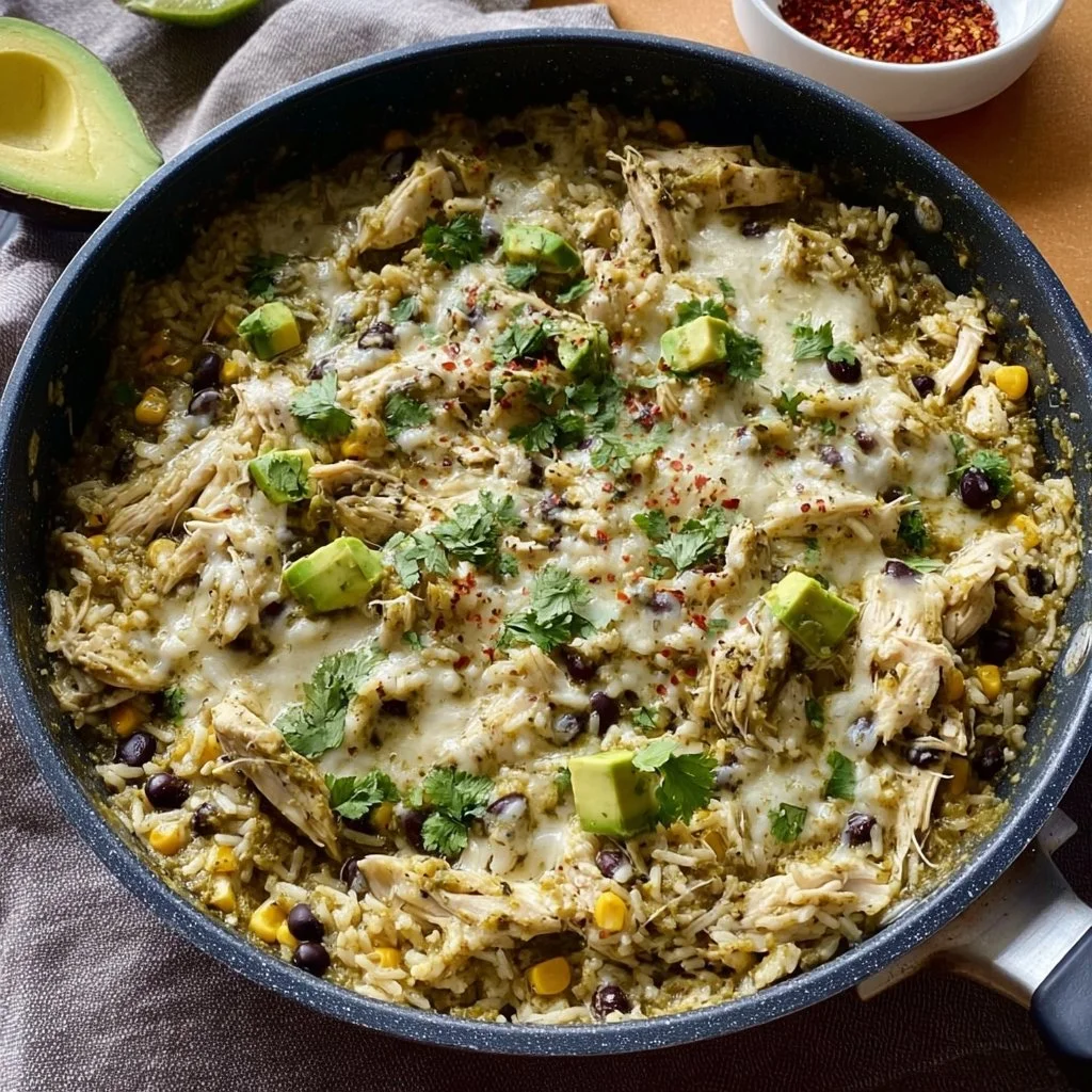 A comforting one-pan dinner featuring shredded chicken, zesty salsa verde, and beans, ready in under 30 minutes.