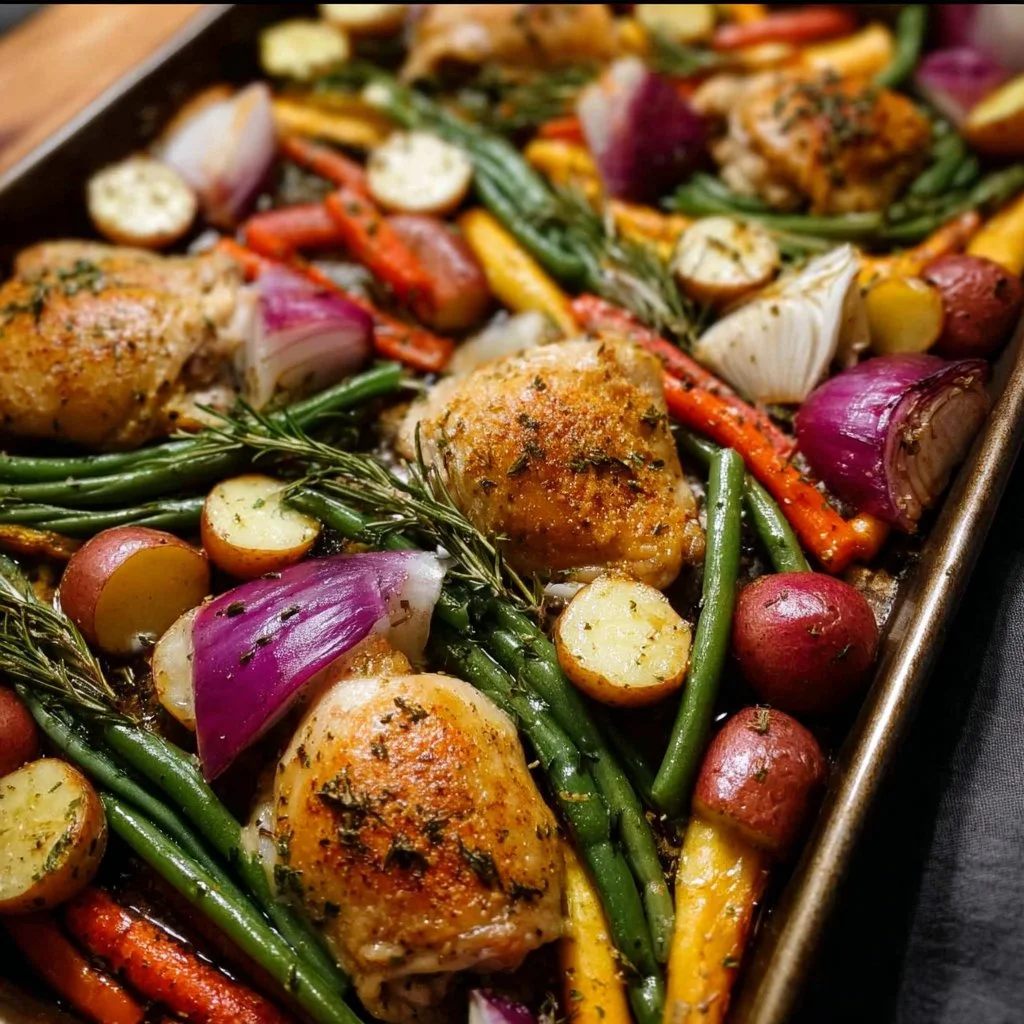 A comforting one-pan meal featuring chicken and fresh vegetables, perfect for busy family nights.