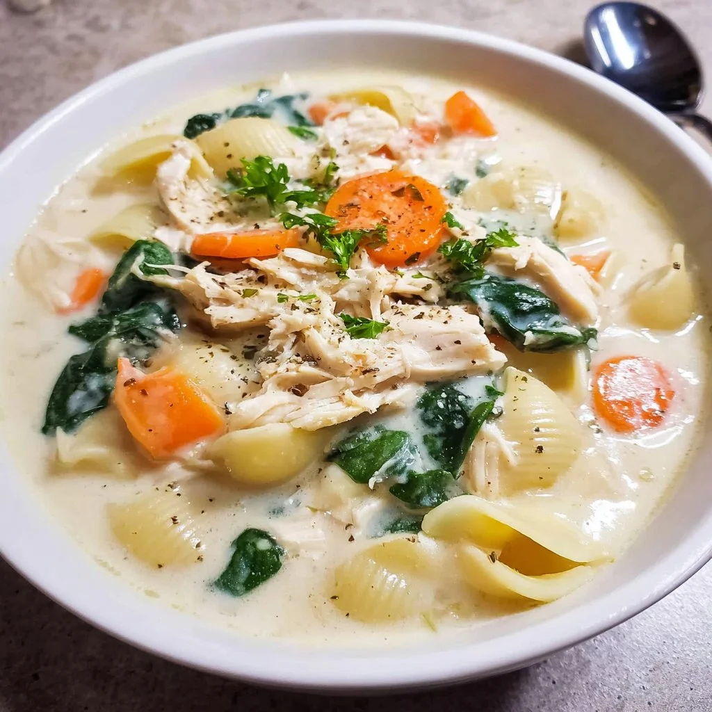 A comforting creamy chicken soup with pasta and spinach, perfect for a cozy night in.