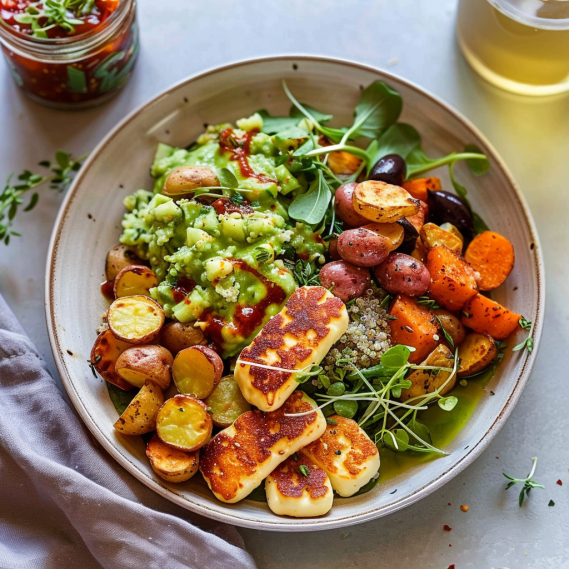 A quick and flavorful Greek-inspired power bowl featuring crispy halloumi, herb roasted potatoes, fluffy quinoa, and fresh vegetables. Perfect for a healthy weeknight meal.