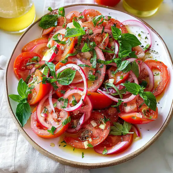 I’ve been making tomato salads for over fifteen years, and I can honestly say this recipe has become my go-to throughout the summer months. While I love a classic caprese, this salad takes those familiar flavors and elevates them with a few simple additions that make all the difference. The combination of sweet cherry tomatoes, creamy burrata, and a tangy vinaigrette creates something truly special.