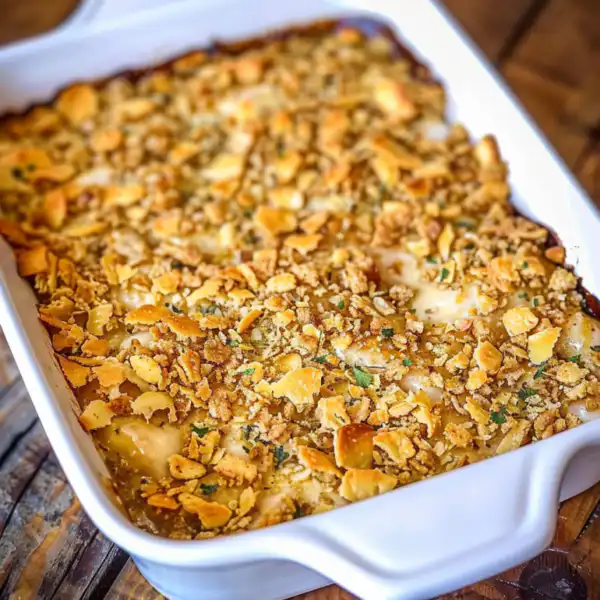 A comforting chicken casserole with tender chicken pieces in a rich, creamy sauce topped with golden, buttery crackers that bake to crispy goodness.