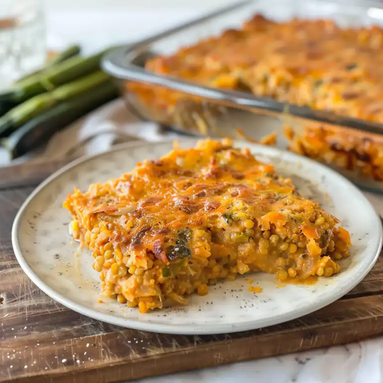 A hearty, nutritious casserole combining tender red lentils with colorful vegetables in a savory tomato-herb sauce, baked until golden and delicious.